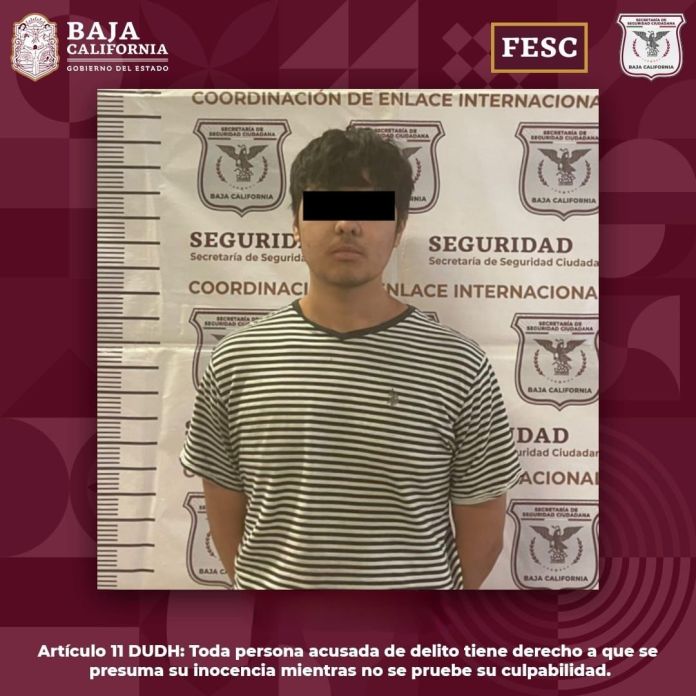 TIJUANA.- Un hombre de 19 años de edad que se encontraba prófugo de la justicia de Estados Unidos, fue detenido por agentes de la Coordinación de Enlace Internacional de la Fuerza Estatal de Seguridad Ciudadana (FESC) en las inmediaciones de la colonia El Peñón en la ciudad de Tijuana; el joven está acusado por el delito de posesión de arma de fuego en zona escolar e intento de homicidio.